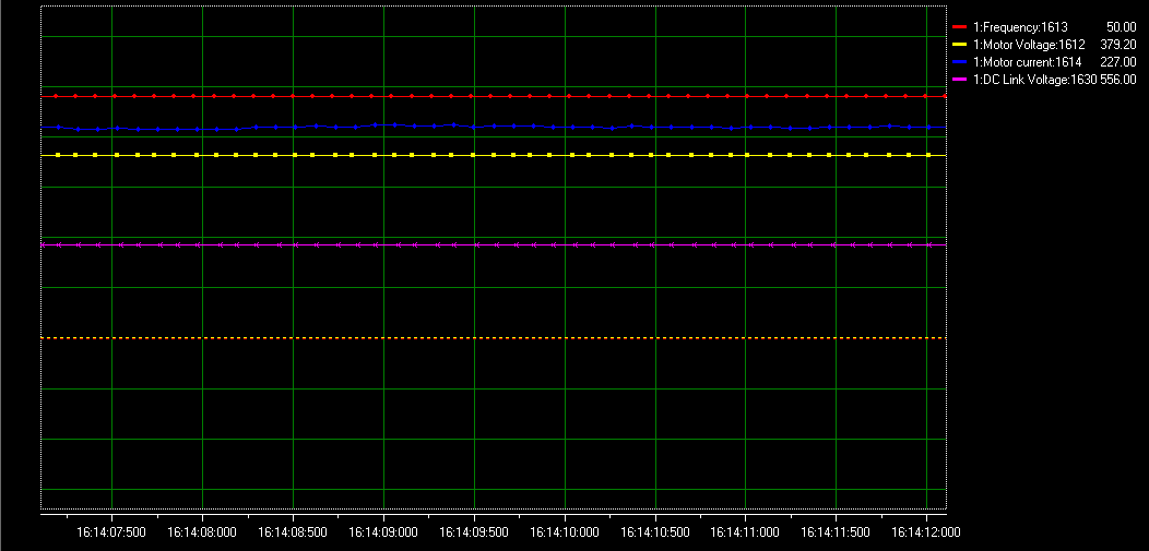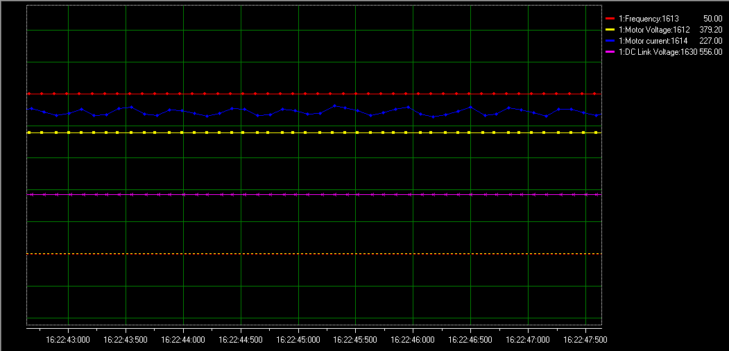 對以上參數(shù)進行調(diào)整后,客戶描述的現(xiàn)象(電機的震動和噪音)明顯得到解決,以下為變頻器經(jīng)過調(diào)整過后的電機波形和音頻文件