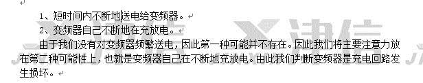 更換變頻器充電卡,依次安裝好變頻器的電源卡,控制卡,操作面板及上蓋板等。檢查變頻器的二極管特性及對(duì)地絕緣,符合送電的標(biāo)準(zhǔn)。將變頻器送電,自檢通過后,測(cè)量輸入側(cè)電源電壓,輸入變頻器參數(shù),開機(jī)輸出電壓平衡。帶負(fù)載測(cè)量輸入和輸出電流平衡,變頻器修復(fù)。